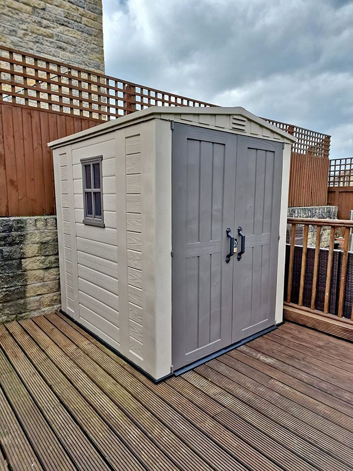 The Factor 6 x 6 garden shed provides a medium size outdoor storage solution for the garden - ideal for everything from garden tools and equipment to furniture, bicycles and ladders. Wide-opening double doors provide convenient access to contents, while an integral window (which can be located on either side of the shed) and skylight provide ample access for natural light. There are also air vents to enable air circulation, as well as prevent condensation and build-up of moisture. Complete with two shelves and brackets, while a heavy-duty floor helps to keep wet weather and unwanted pests out. Designed to be secured with a standard padlock (not included) for peace of mind.Manufactured in durable, weather-resistant plastic with steel reinforcement, the factor 6 x 6 is designed to be virtually maintenance and fade-free. Just an occasional light wash is all that is required to keep it looking like new. The factor 6 x 6 is designed for self-assembly with a limited knowledge of DIY skills.