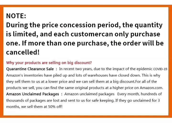 🎉🎉Why Are Your Products So Discounted? Full Liquidation: In The Past Two Years, Due To The Impact of The COVID-19 Epidemic, Amazon Has Overstocked and A Large Number Of Warehouses Have Been Closed. This Is Why They Are Sold To Us At A Lower Price, and We Can Sell Them At A Great Discount.