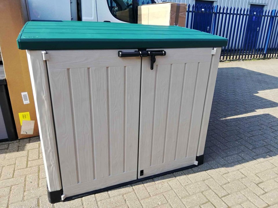 DetailEasy to assemble and easy to use, the global best-selling Store-It-Out MAX provides an ideal outdoor storage solution for everything from barbecues to outdoor furniture. Amazingly compact and versatile, this weather-resistant storage unit will keep up to 1200 L/42 cu.ft. of contents fresh and dry. For your convenience, it features front and top opening, a sloped threshold and bin-opening kit.Features and BenefitsIdeal outdoor storage solution for garden tools, equipment and x2 240 L wheelie binsElegant wood affect panels with a piston-assisted lid and wide opening doors and a 1200 L capacityHeavy-duty floor with main door bolt and secondary foot bolt for secure closureDurable, weather-resistant design - no maintenance or fadingAssembled external dimensions: 145.5 x 82 x 125 cm (L x W x H); internal dimensions: 132 x 76 x 110 cm (L x W x H)Item number: 254661